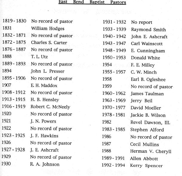Some of the former pastors at East Bend have been: Rev. Robert McNeely, Rev. Fred Hawkins, Rev. John Ashcraft, Rev. Raymond Smith, Rev. Carl J. Wainscott, Rev. Elmer Cunningham, Rev. Donald White, Rev. Eugene Milby, Rev. Charles Minch, Rev. James Taulman, Rev. Jerry Beil, Rev. Steve Alford, Rev. Allen Abbott, with Bro. Kerry Spencer as present pastor. Rev. Albert Weaver, Rev. Bob Maurer, Rev. Edwin Kirkpatrick and Rev. Roy Johnson served as interim pastors.